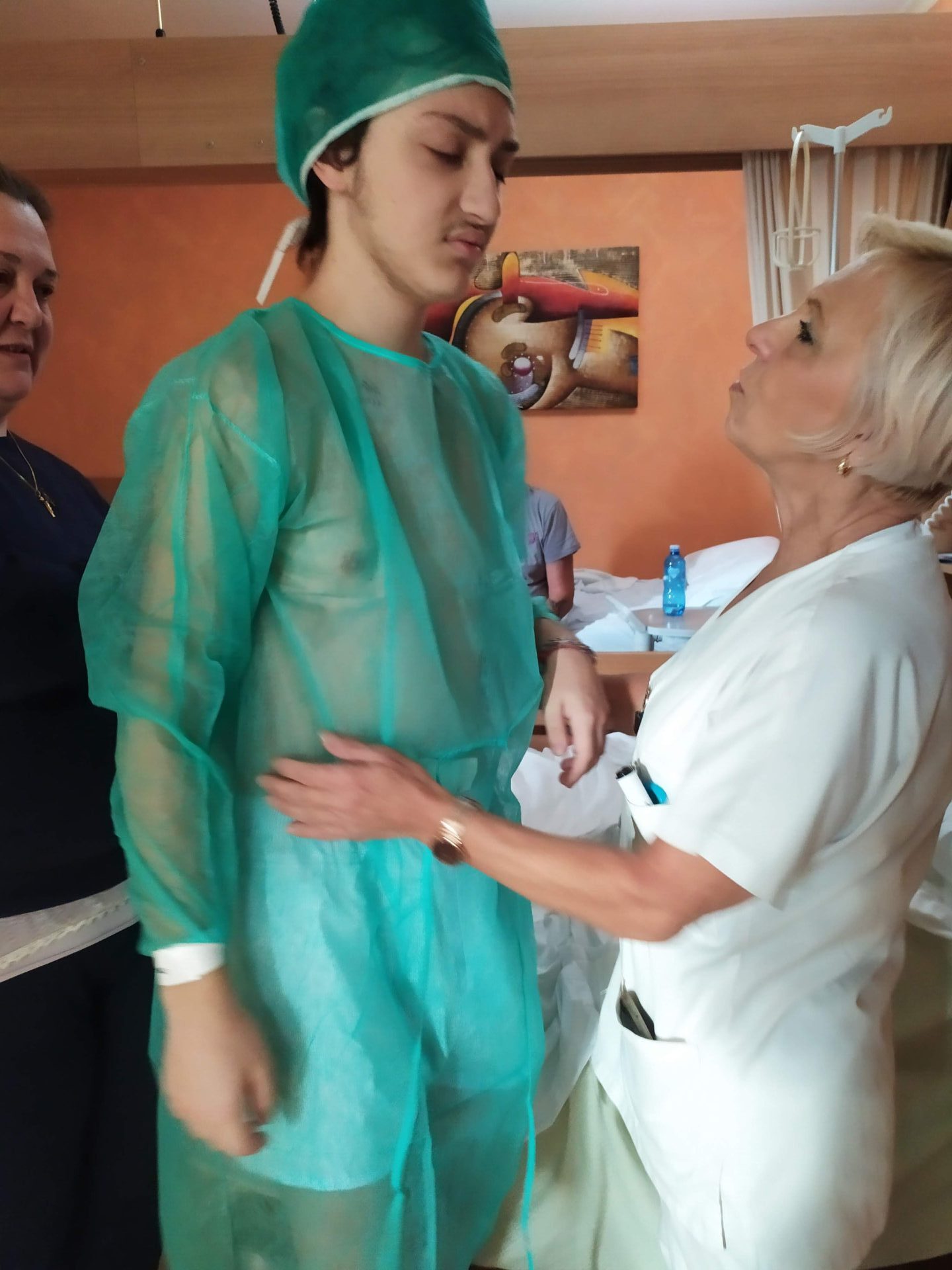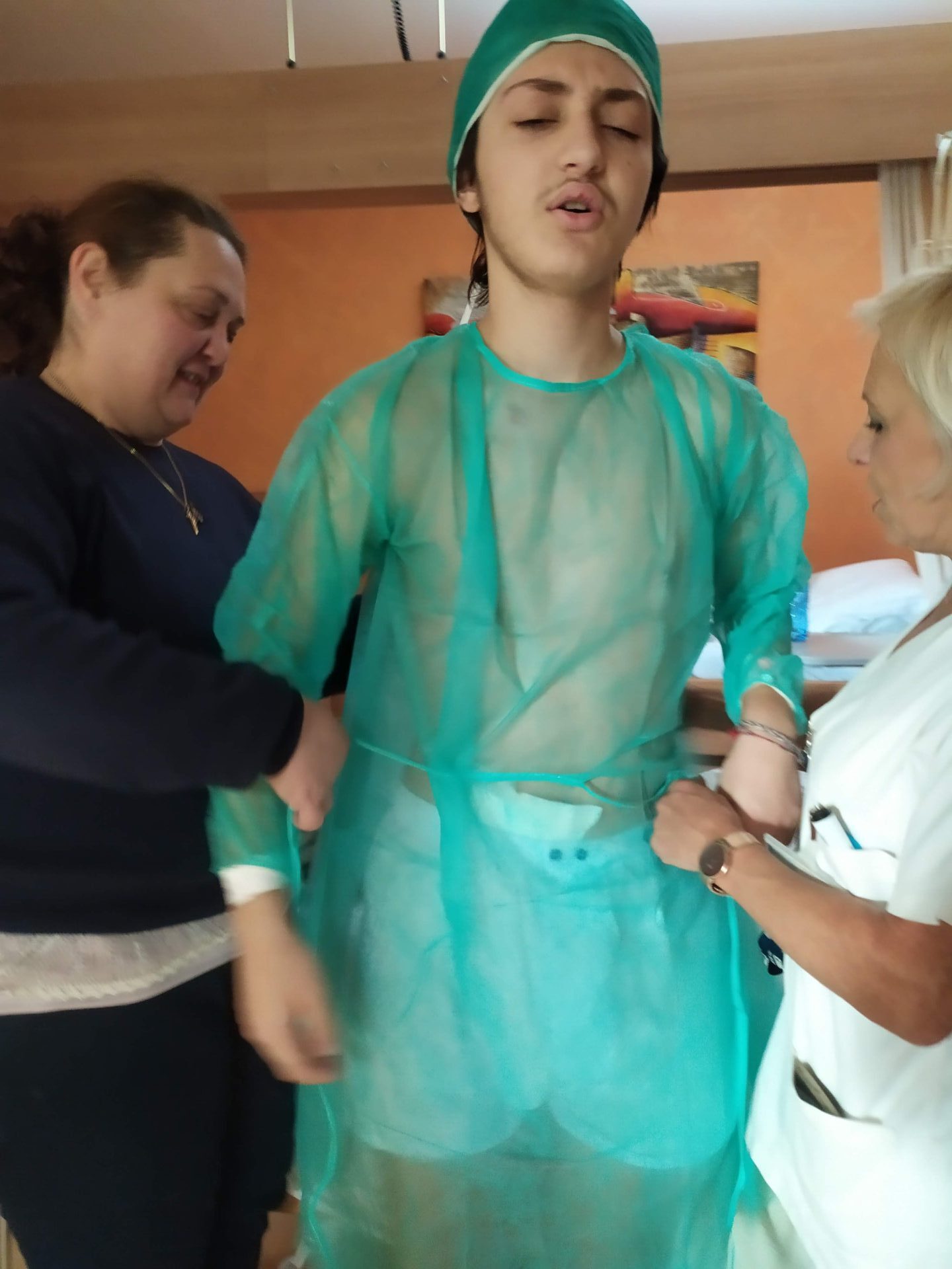 Alle 8.00 sei già pronto, io ti ho aiutato ad indossare ancora una volta quel camice verde e la cuffietta. Nonna Amalia (l’infermiera Amalia Saiello ) pronta con la barella a portarti giù