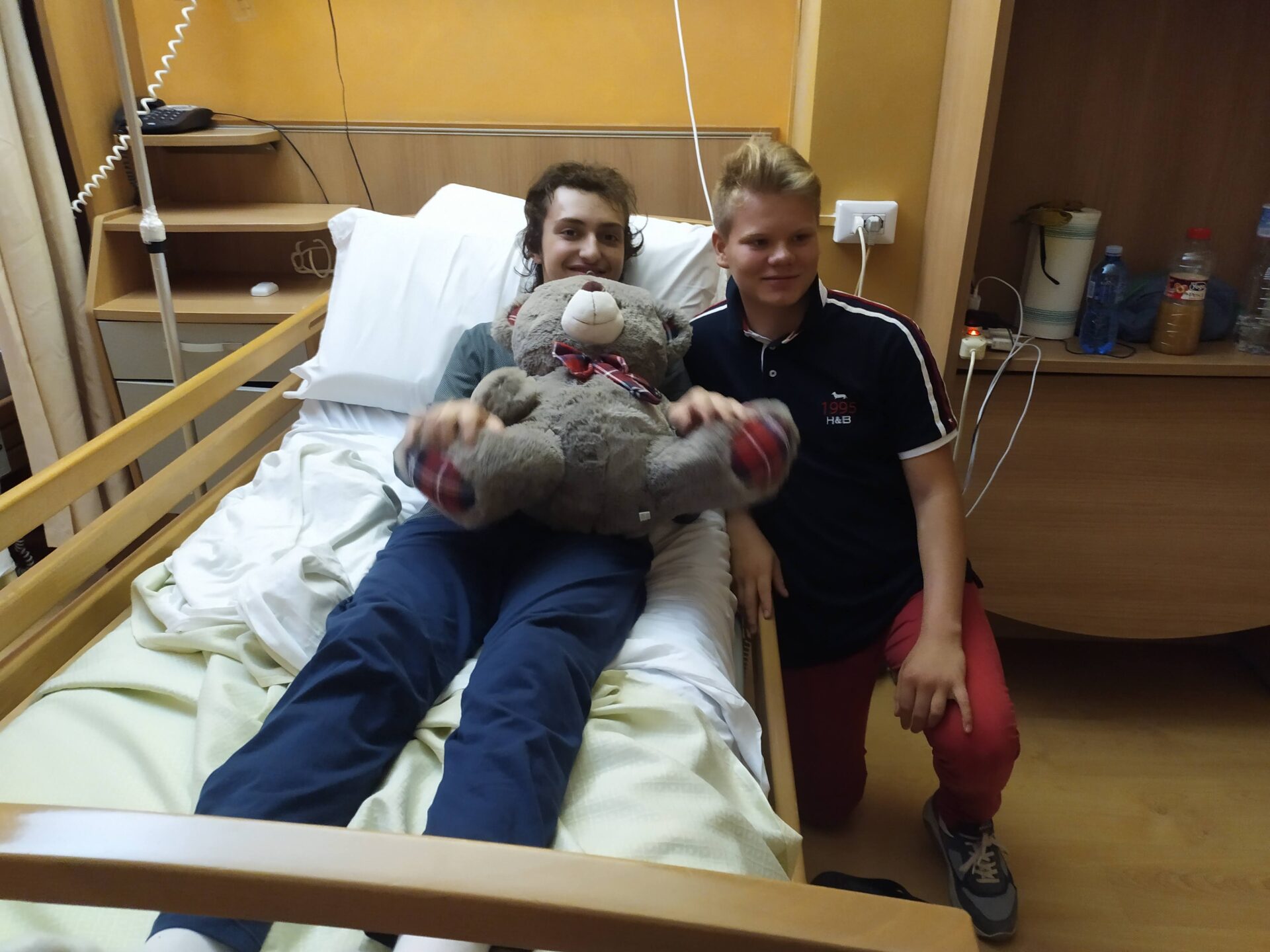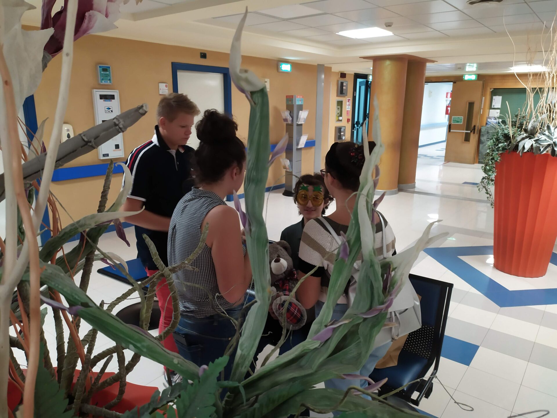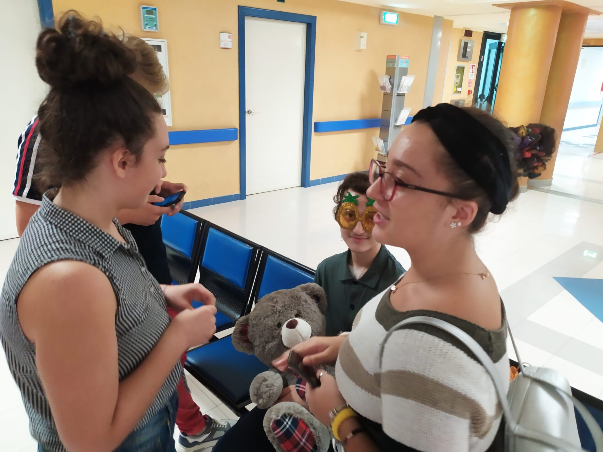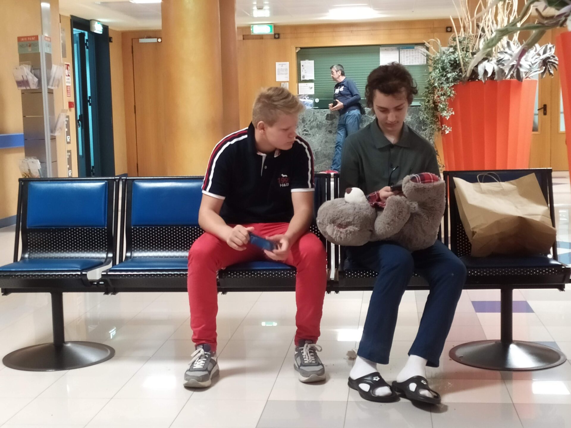 E poi tutti insieme, finalmente Eugenio in piedi con gli amici, a divertirsi nel salone centrale del terzo piano della Neuromed.