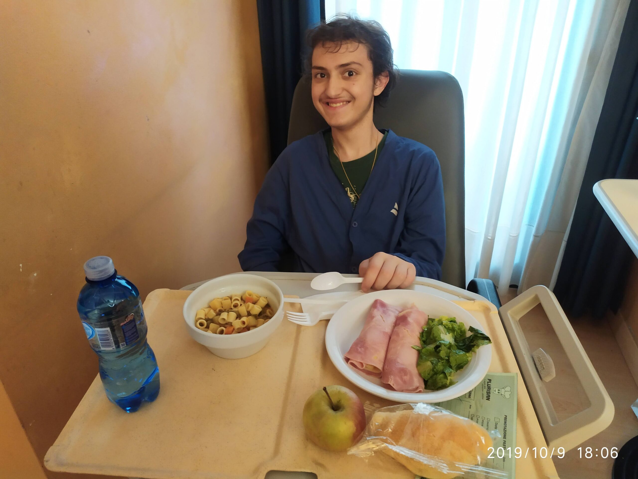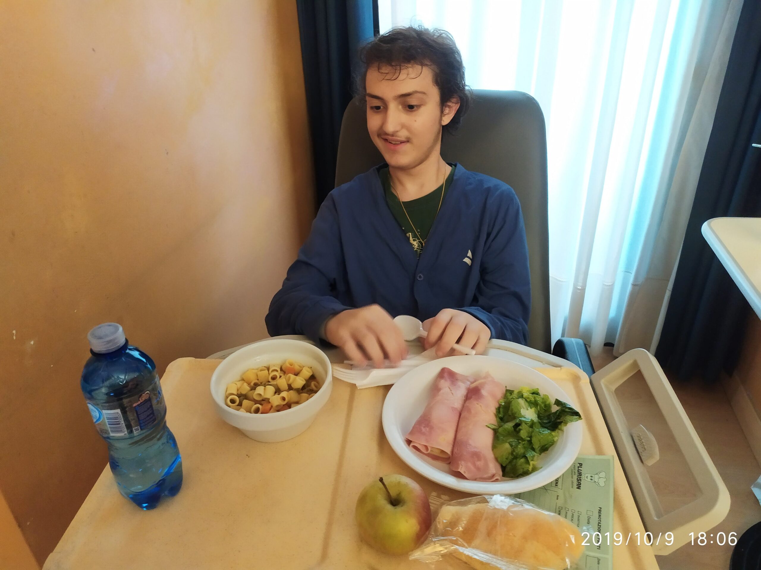 Eugenio mangia tutto con gusto e piacere. Se fossimo a casa sarebbe tutto ancora più gustoso! Ma siamo qui, e stiamo bene, ringraziando Dio.