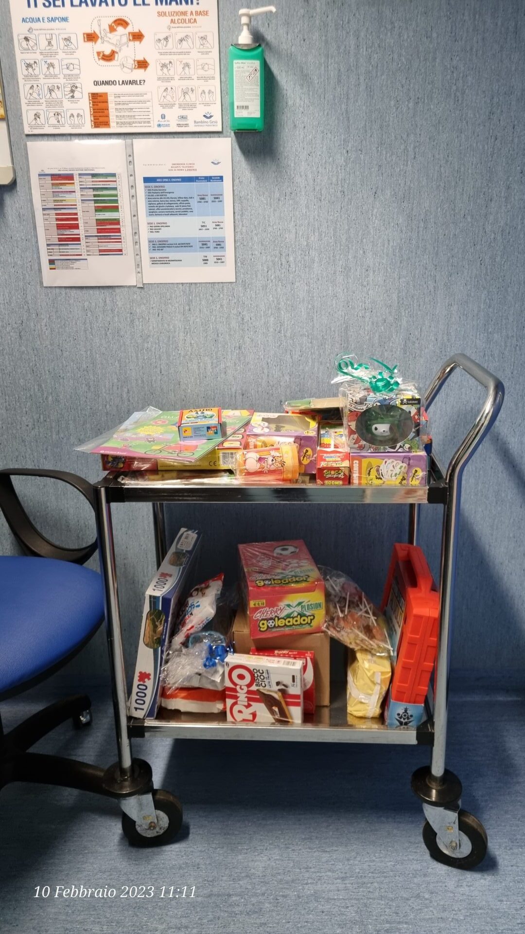 Dolci, libri di favole, pastelli, caramelle, pastelli, giochi da tavolo, ed il tanto desiderato spray rimuovi cerotti! Si, nei nostri contatti con la ludoteca e con la caposala ci fu chiesto di evitare giochi che i bambini, per ovvi problemi, non avrebbero potuto utilizzare (hanno depositi pieni di palloni da calcio, difficili da usare in ospedale) ma di dirottare le nostre risorse su un prodotto che avrebbe sicuramente portato gioia e sollievo ai piccoli pazienti.