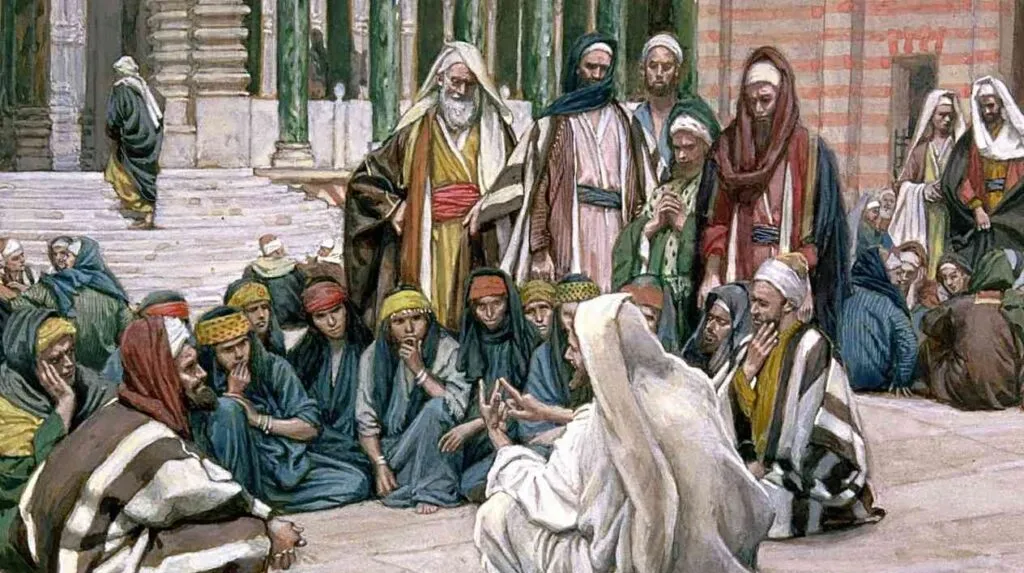 Quando fu uscito di là, gli scribi e i farisei cominciarono a trattarlo in modo ostile e a farlo parlare su molti argomenti, tendendogli insidie, per sorprenderlo in qualche parola uscita dalla sua stessa bocca.