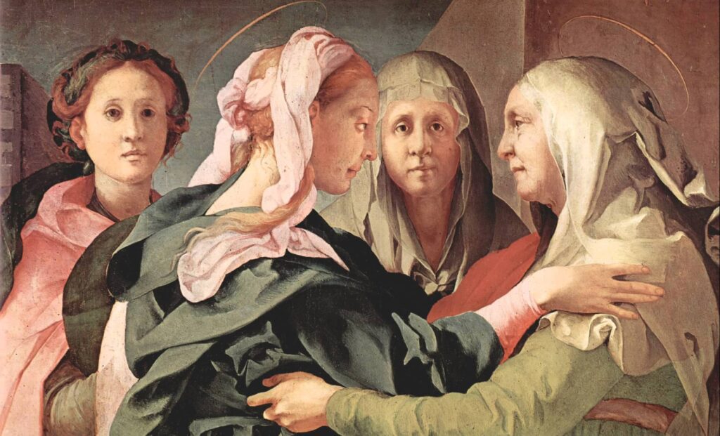 Entrata nella casa di Zaccarìa, salutò Elisabetta. Appena Elisabetta ebbe udito il saluto di Maria, il bambino sussultò nel suo grembo. Elisabetta fu colmata di Spirito Santo ed esclamò a gran voce: «Benedetta tu fra le donne e benedetto il frutto del tuo grembo! A che cosa devo che la madre del mio Signore venga da me? Ecco, appena il tuo saluto è giunto ai miei orecchi, il bambino ha sussultato di gioia nel mio grembo. E beata colei che ha creduto nell’adempimento di ciò che il Signore le ha detto».