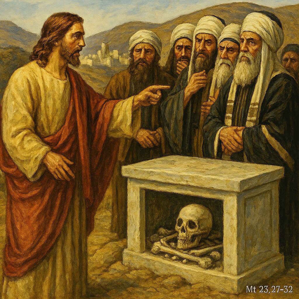 In quel tempo, Gesù parlò dicendo: ««Guai a voi, scribi e farisei ipocriti, che assomigliate a sepolcri imbiancati: all’esterno appaiono belli, ma dentro sono pieni di ossa di morti e di ogni marciume. Così anche voi: all’esterno apparite giusti davanti alla gente, ma dentro siete pieni di ipocrisia e di iniquità.