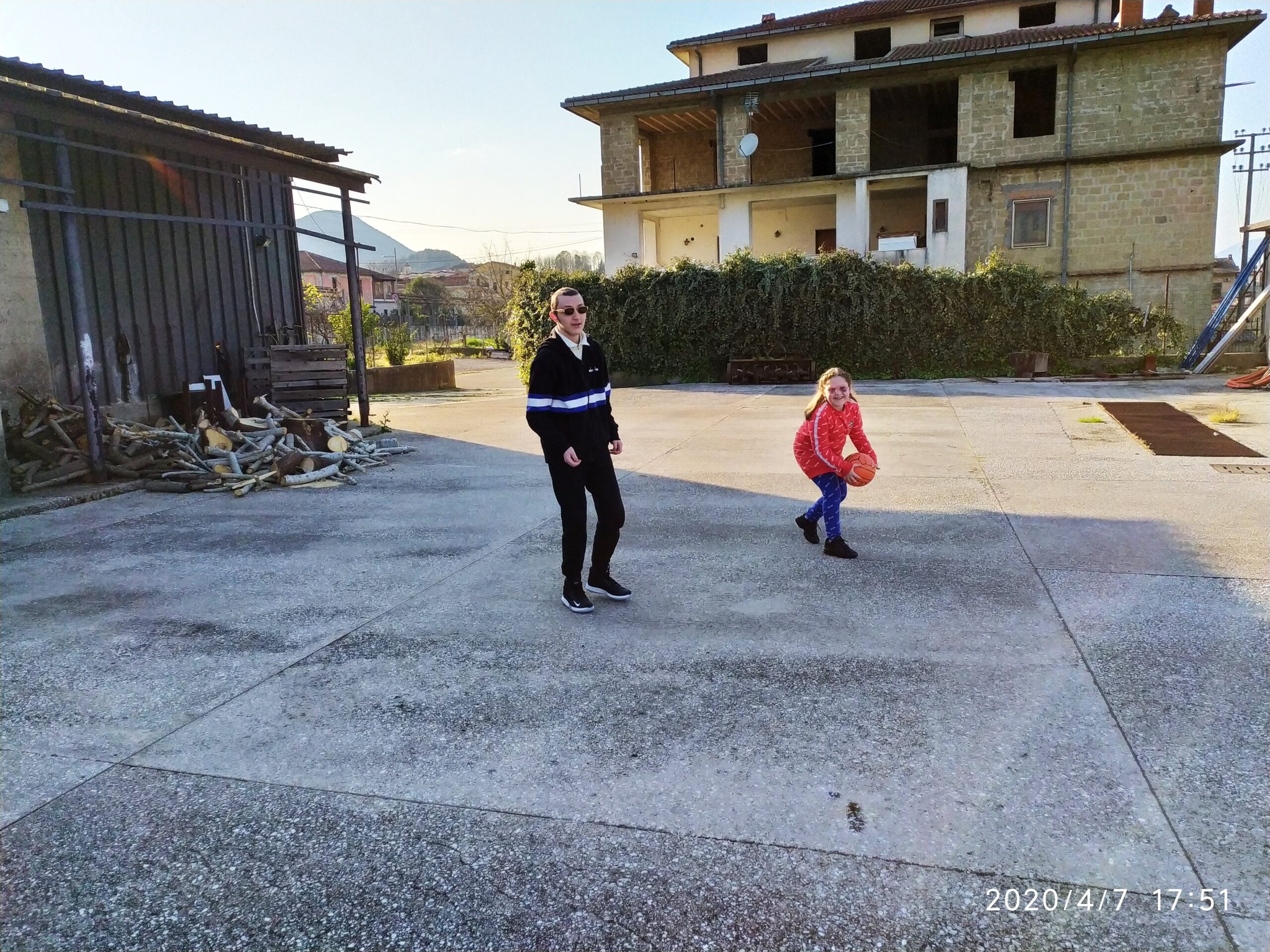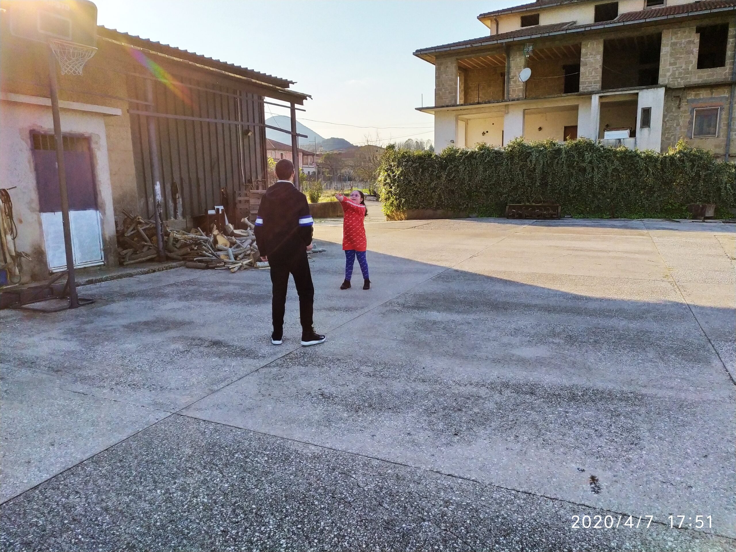 Finiti i compiti, la giornata è troppo bella ed invitante per lasciarcela sfuggire: prendiamo il pallone SuperSantos per la pallavolo di Francesca, ed il pallone a spicchi “da basket” per Eugenio, ed andiamo sul retro di casa dove un canestro alto 3.05 metri.