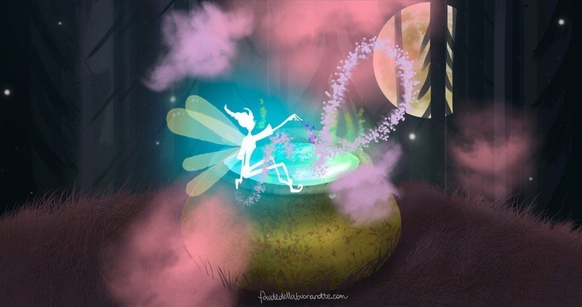 Anche questa volta il vortice che si generò era forte e intenso e il pentolone resistette un minuto in più per poi rovesciarsi per la seconda volta. Mamma Fata era forte e tenace e non si arrese, si procurò immediatamente un meraviglioso pentolone d’oro. Attese con ansia il giorno della luna piena e ricominciò a mescolare i preziosi ingredienti nel pentolone dorato.