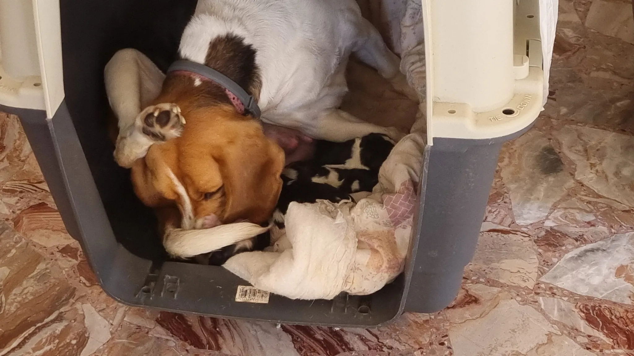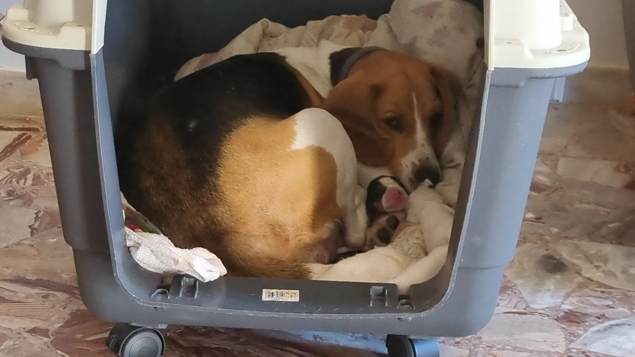 Vediamo e sentiamo qualche vagito, tanto movimento di Lussy che lecca voracemente il suo neonato cucciolo, e nel mentre una seconda testolina fa capo nel batuffolo canino creato dalla neomamma beagle.