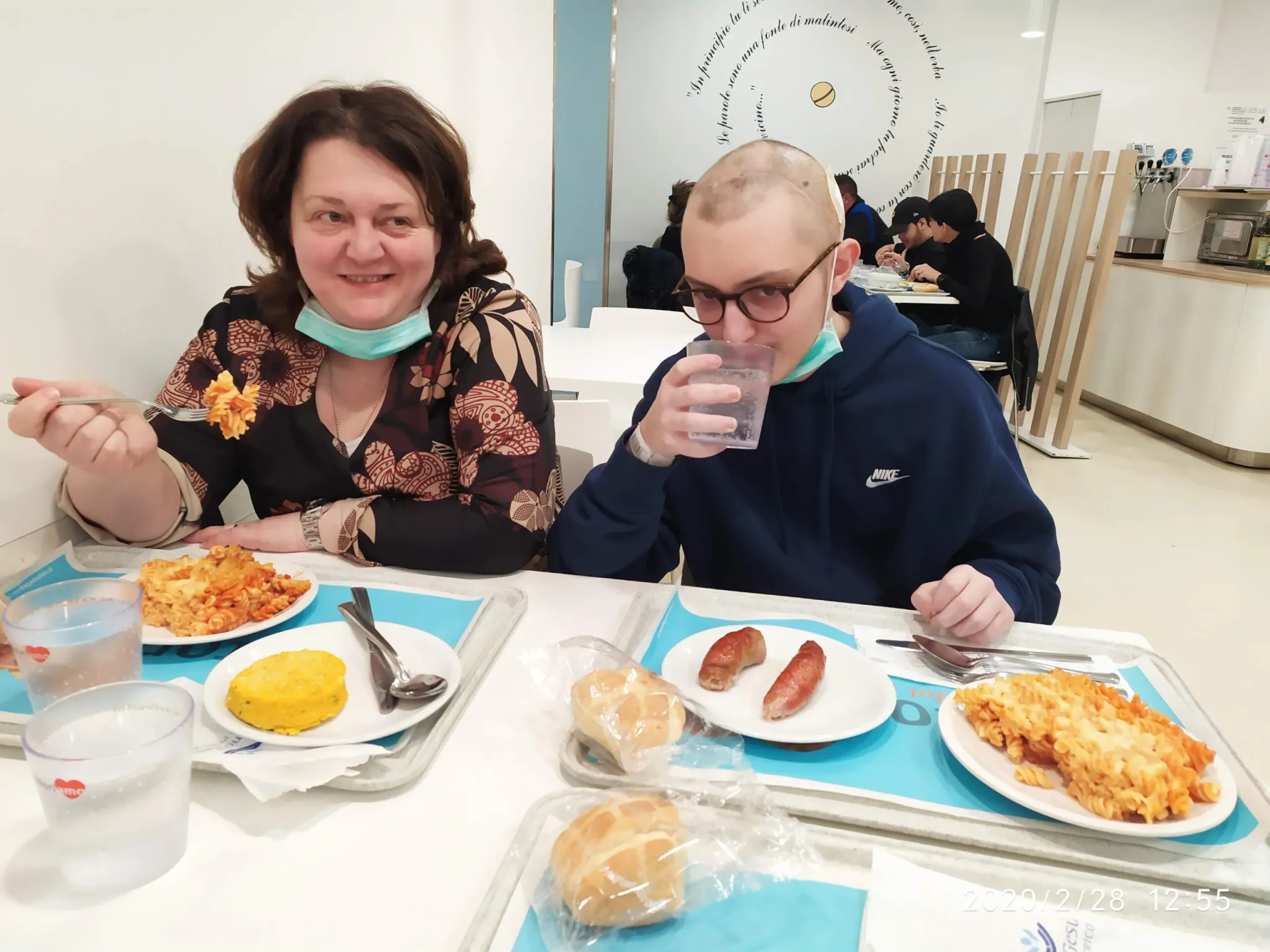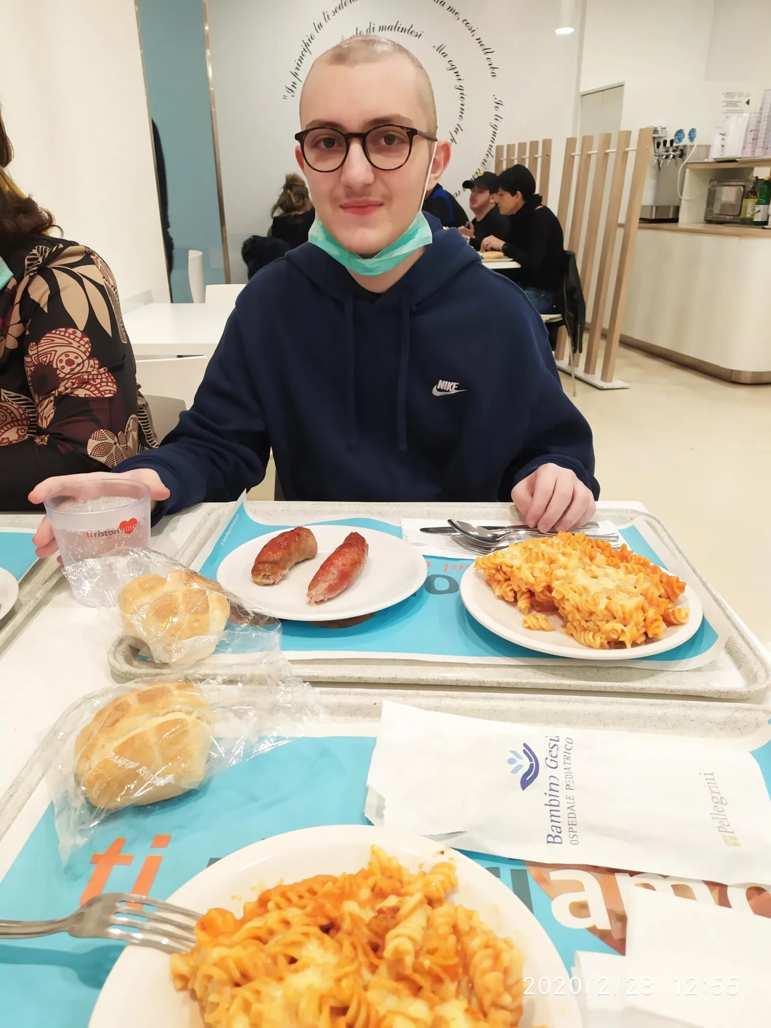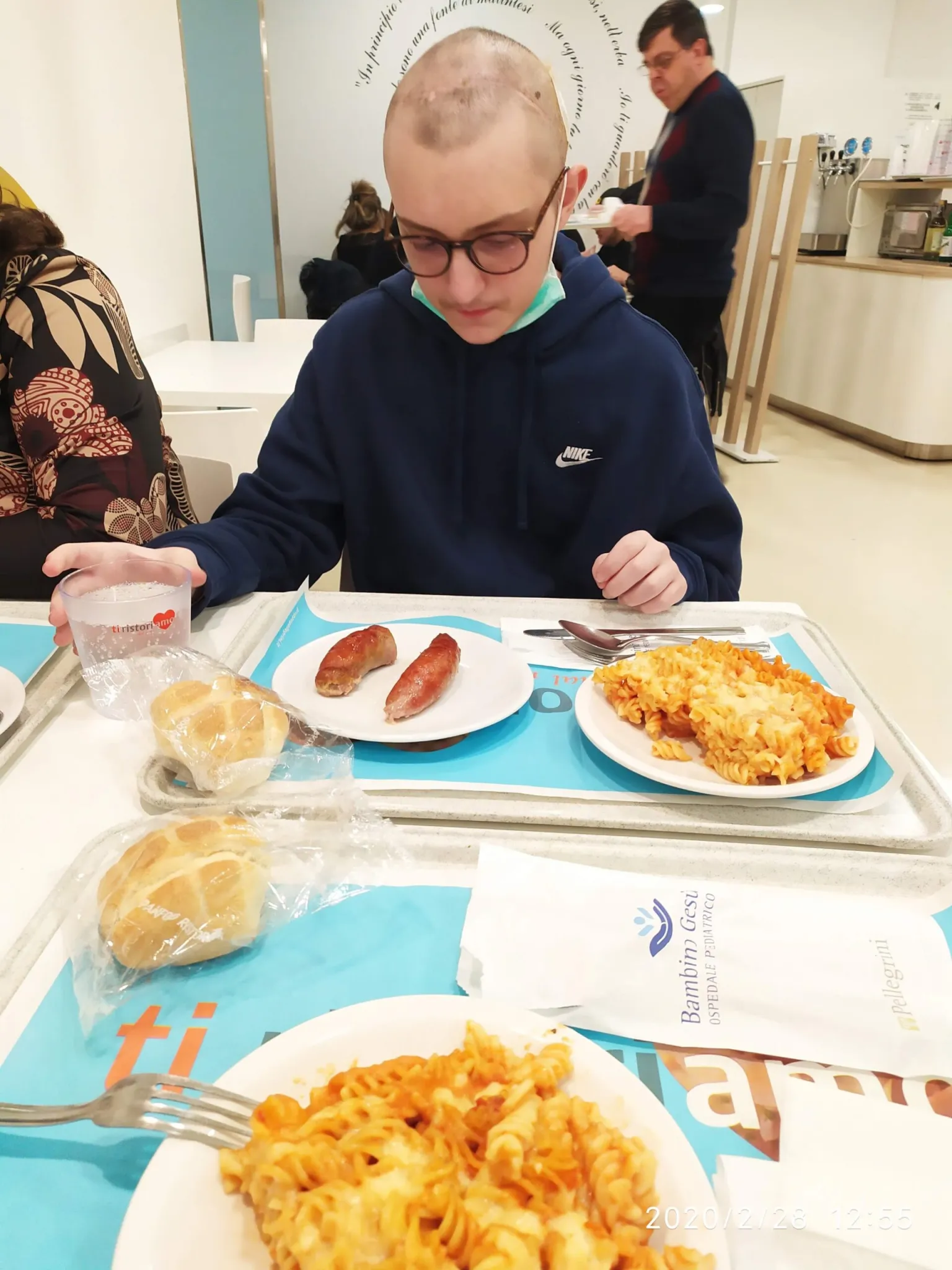 Alla mensa dell’OPBG una dolcissima e affettuosa inserviente, visto lo stato piuttosto smagrito di Eugenio, gli propina una maxi porzione di pasta al forno. Il secondo sono ottime salsicce.