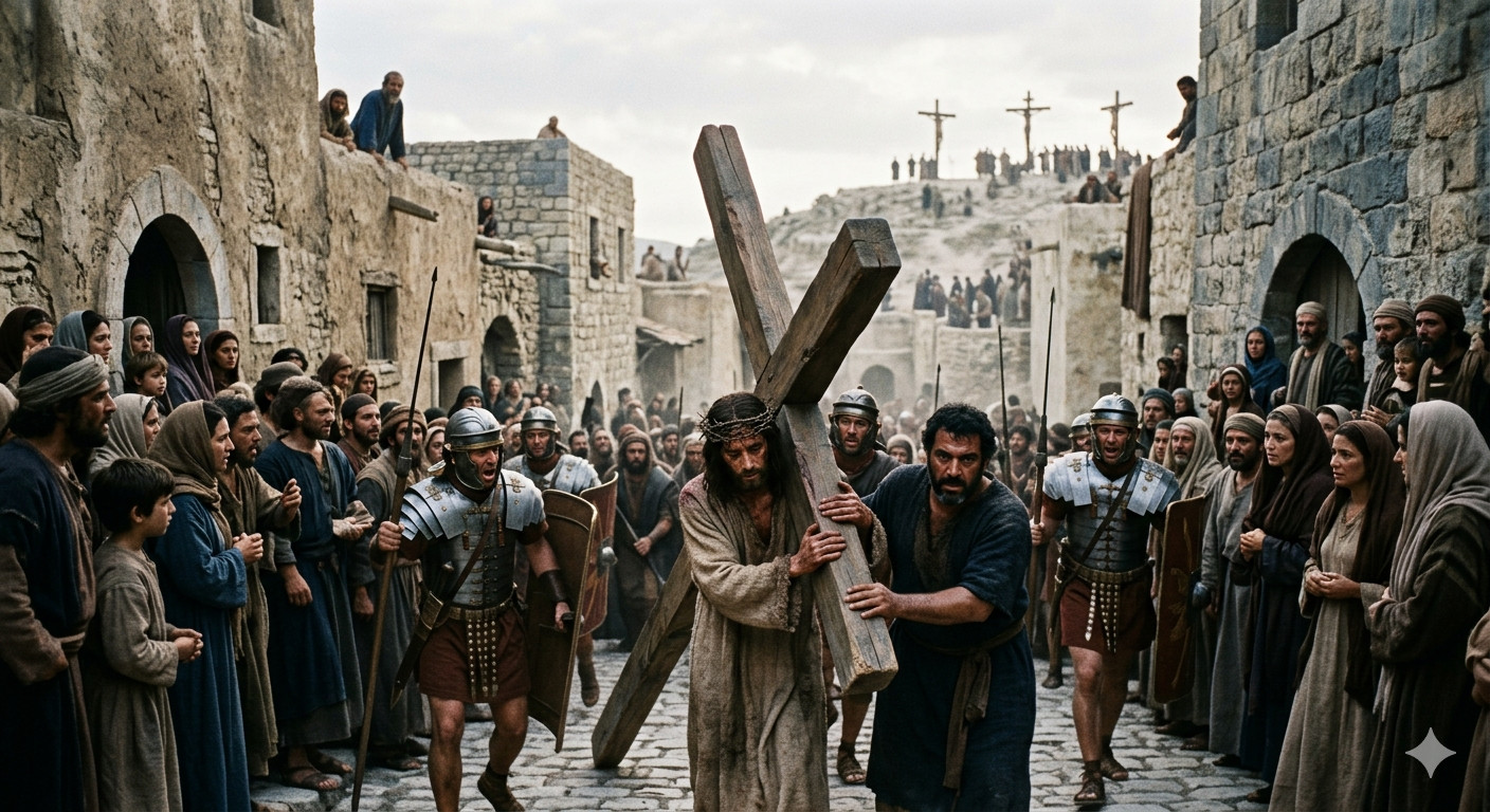 Mentre uscivano, incontrarono un uomo di Cirene, chiamato Simone, e lo costrinsero a portare la sua croce. Giunti al luogo detto Gòlgota, che significa «Luogo del cranio», gli diedero da bere vino mescolato con fiele. Egli lo assaggiò, ma non ne volle bere. Dopo averlo crocifisso, si divisero le sue vesti, tirandole a sorte.