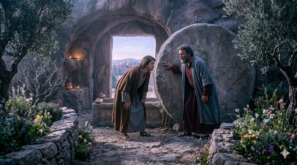 Entrando nel sepolcro, non trovano il corpo, ma i teli posati là e il sudario avvolto in un luogo a parte. È un dettaglio che Giovanni sottolinea con forza: non è stato un furto, perché un ladro non avrebbe ripiegato le bende con cura. È l’ordine di Dio che vince il caos della morte.