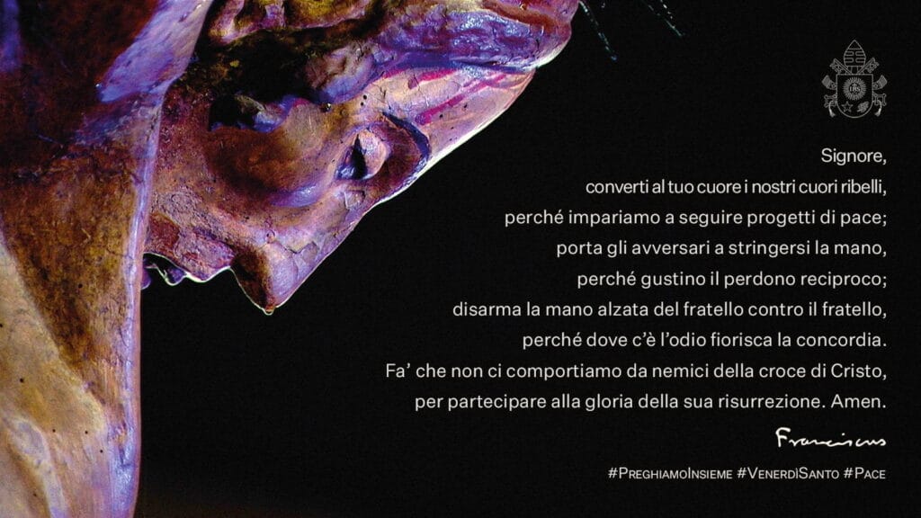 Signore, converti al tuo cuore i nostri cuori ribelli, perché impariamo a seguire progetti di pace; porta gli avversari a stringersi la mano, perché gustino il perdono reciproco; disarma la mano alzata del fratello contro il fratello, perché dove c’è l’odio fiorisca la concordia. Fa’ che non ci comportiamo da nemici della croce di Cristo, per partecipare alla gloria della sua risurrezione. Amen.